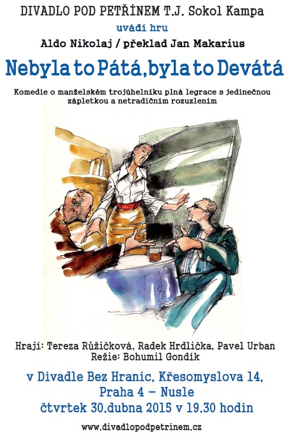 Komedie Aldo Nikolaje v nastudování Divadla pod Petřínem (Sokol Kampa). Režie: Bohumil Gondík