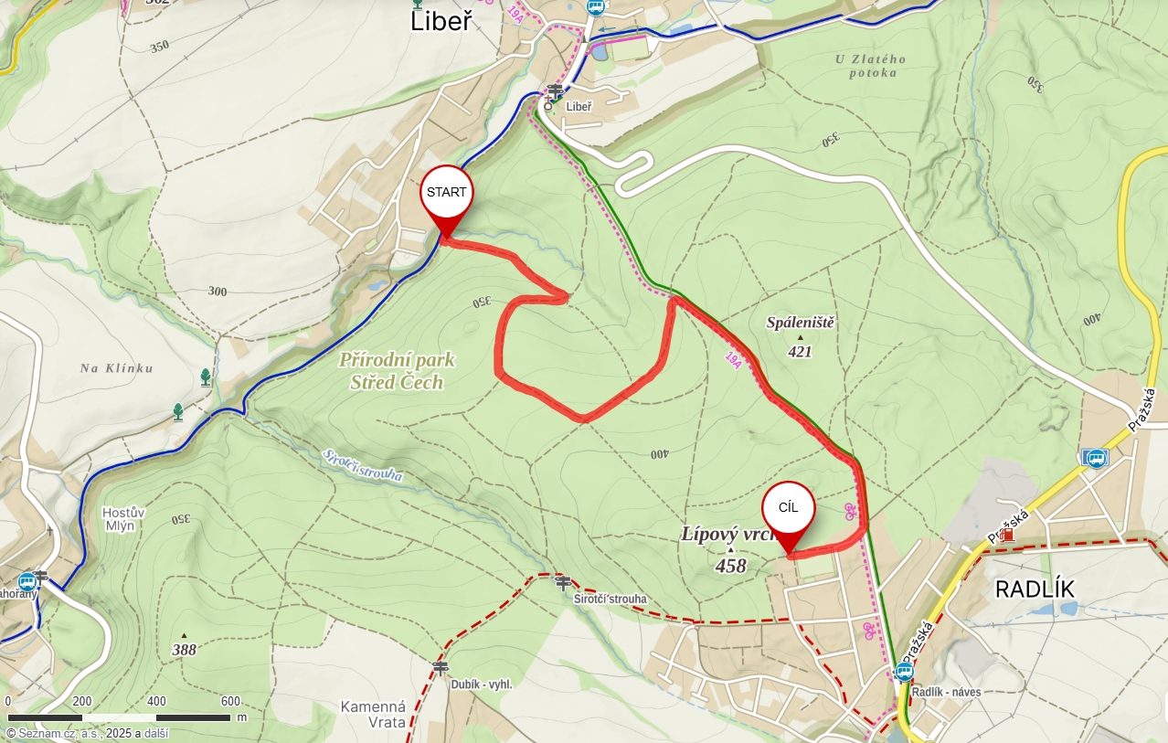 Start je asi 400 m od Libře po proudu Záhořanského potoka na křižovatce ve tvaru T. Hned úvodní metry po široké, trochu písčité cestě jsou hodně strmé, postupně se sklon trochu zmírňuje a po 300 m přijde na křižovatce ostrá vracečka doprava. Po kratičké rovince následuje prudký levotočivý výšvih, který postupně přejde v táhlé stoupání a cca na 1km trati začíná skoro 400m seběh. Vše stále po široké lesní cestě, teď víc štěrkovité. Po seběhu se trať napojí na zelenou turistickou značku, která stoupá, v závěru opět dost strmě, až na kraj Radlíku, kde se sklon narovnává a po chvíli trať odbočí doprava na asfaltovou cestu. To už do cíle zbývá jen asi 200m víceméně po rovině, jen asfalt ke konci vystřídá hlína.